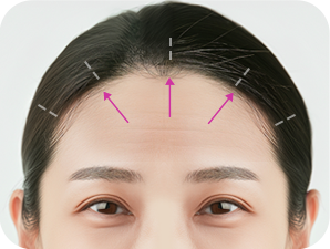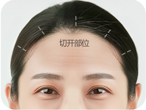 于发际线内侧的头皮上,包含之前额头提拉疤痕在内,切开1厘米左右的纵向切口(5处)