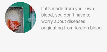 Instead of only injecting autologous cartilage, we also inject fibrin concentrate separated from the patient’s blood. This fibrin concentrate increases the viscosity to prevent the cartilage particles from dispersing and contains growth factors that enhance cartilage survival, improving the success rate of autologous cartilage grafts.